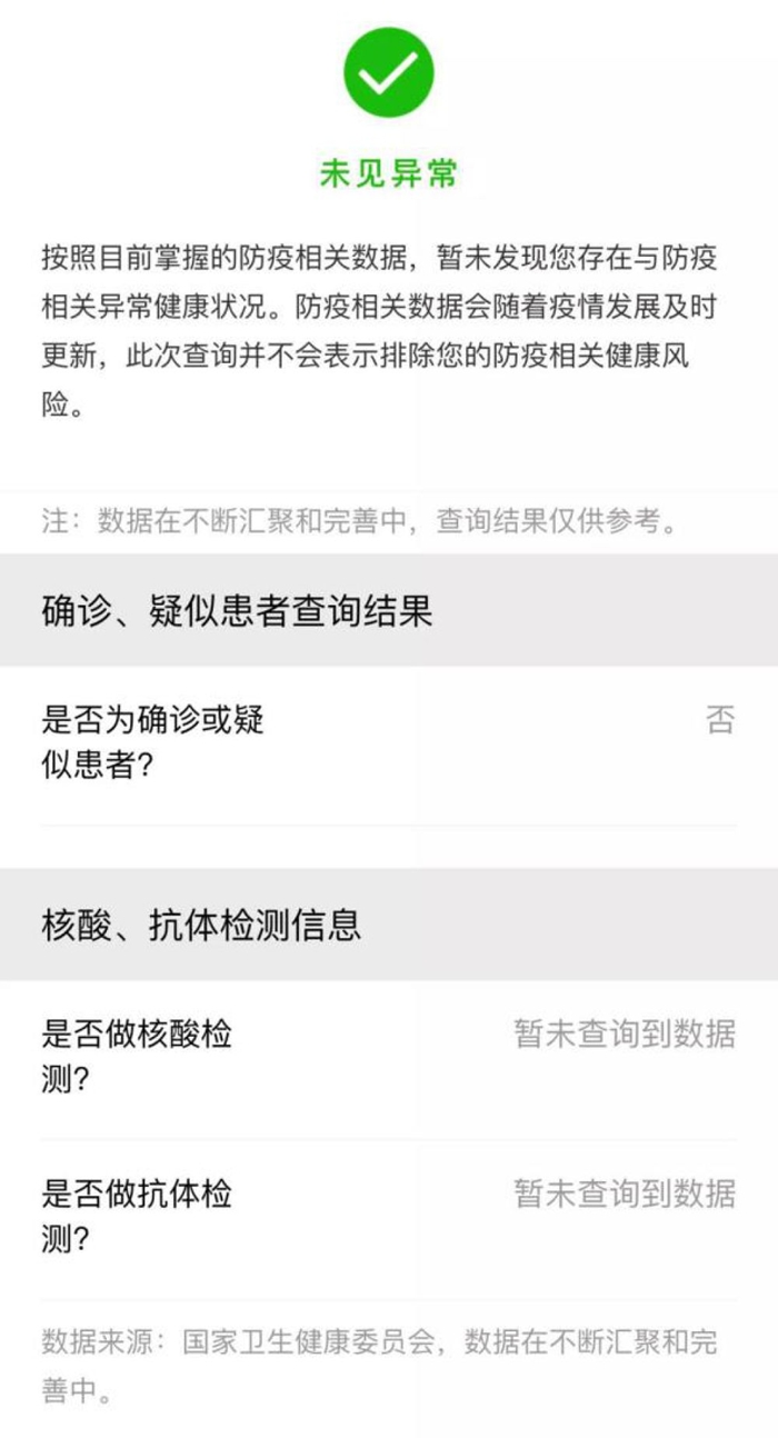 此外,核酸和抗體檢測(cè)結(jié)果信息還納入了全國(guó)一體化平臺(tái)“防疫健康信息碼”服務(wù)。用戶可通過(guò)國(guó)家政務(wù)服務(wù)平臺(tái)微信、支付寶、百度小程序,根據(jù)操作指引申領(lǐng)國(guó)家平臺(tái)的“防疫健康信息碼”,“防疫健康信息碼”會(huì)如實(shí)反映本人7天內(nèi)核酸及抗體檢測(cè)結(jié)果。如核酸檢測(cè)結(jié)果為陰性,則防疫健康風(fēng)險(xiǎn)狀態(tài)顯示“未見(jiàn)異?!?。如核酸檢測(cè)結(jié)果為陽(yáng)性,則會(huì)出現(xiàn)“核酸檢測(cè)結(jié)果為陽(yáng)性”的出行提示。如果7天內(nèi)未做過(guò)核酸及抗體檢測(cè),防疫健康信息會(huì)根據(jù)個(gè)人當(dāng)前提供的相關(guān)數(shù)據(jù)顯示健康風(fēng)險(xiǎn)結(jié)果。