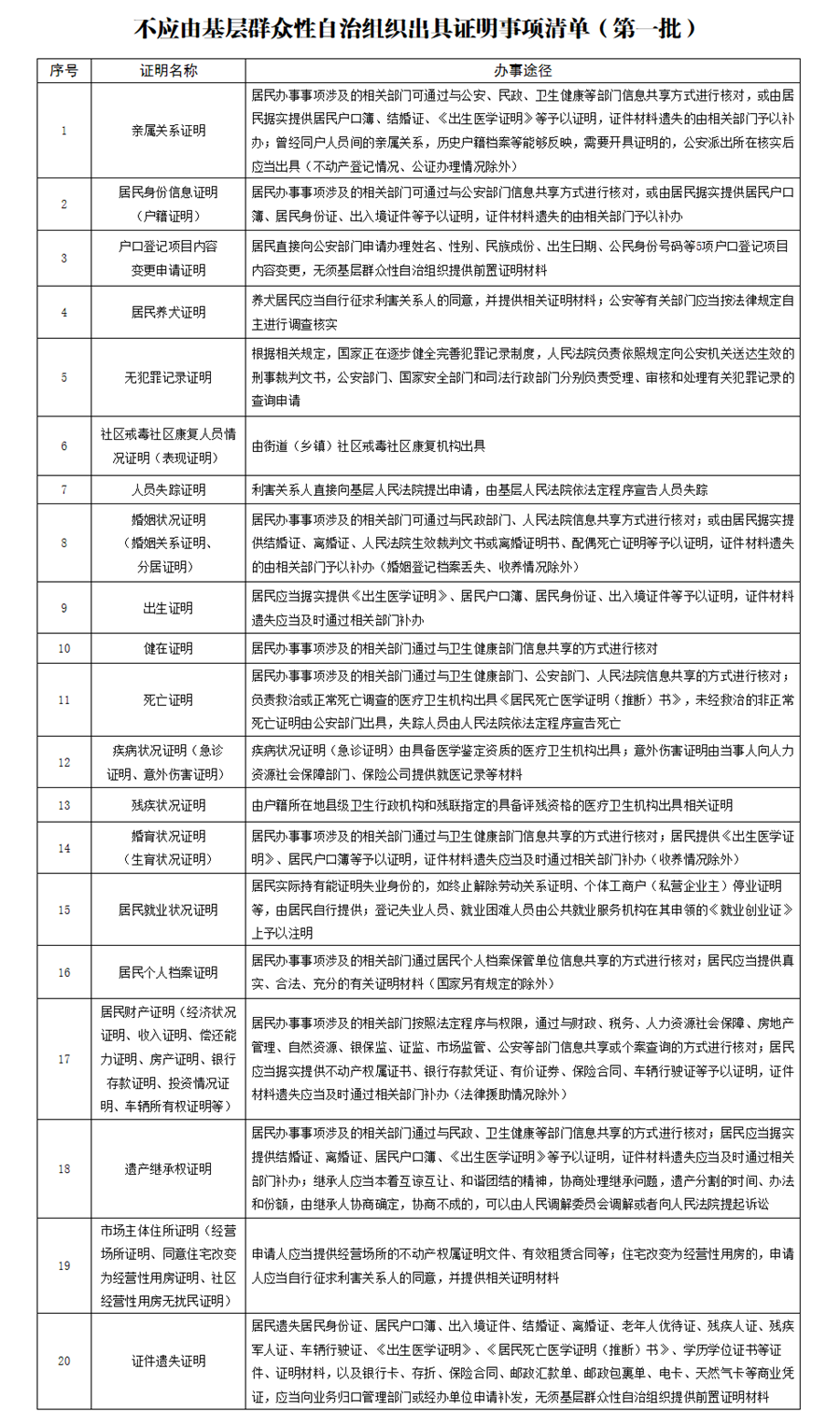 這20項證明包括:親屬關系證明、居民身份信息證明、戶口登記項目內(nèi)容變更申請證明、居民養(yǎng)犬證明、無犯罪記錄證明、社區(qū)戒毒社區(qū)康復人員情況證明、人員失蹤證明、婚姻狀況證明、出生證明、健在證明、死亡證明、疾病狀況證明、殘疾狀況證明、婚育狀況證明、居民就業(yè)狀況證明、居民個人檔案證明、居民財產(chǎn)證明、遺產(chǎn)繼承權證明、市場主體住所證明、證件遺失證明。