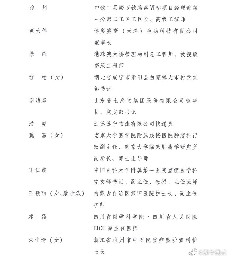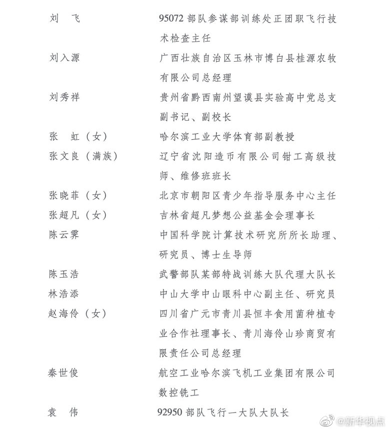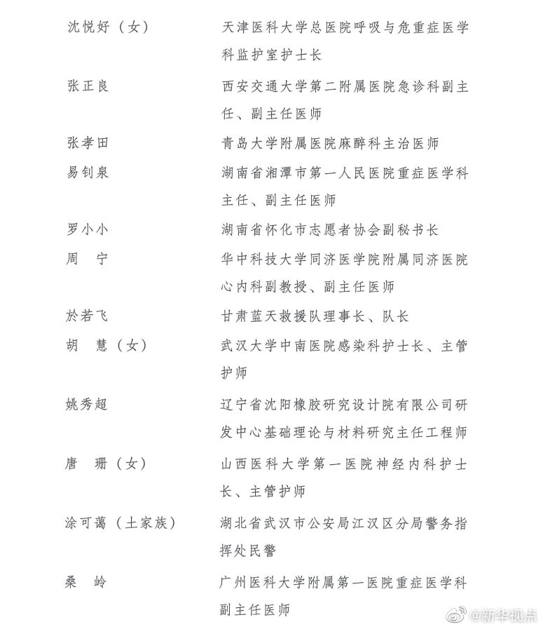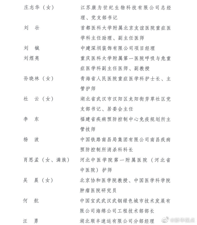 榮獲第24屆“中國青年五四獎?wù)隆钡姆謩e是:江蘇省南京市鼓樓區(qū)方家營消防救援站站長助理、三級消防長丁良浩,安徽省滁州市定遠(yuǎn)縣吳圩鎮(zhèn)西孔村黨總支第一書記王萌萌(女),廈門大學(xué)航空航天學(xué)院常務(wù)副院長、特聘教授、博士生導(dǎo)師尤延鋮,湖北省黃岡市羅田縣希望小學(xué)校長方榮(女),浙江每日互動網(wǎng)絡(luò)科技股份有限公司董事長兼總經(jīng)理、黨委書記方毅,浙江省杭州市拱墅區(qū)職業(yè)高級中學(xué)美發(fā)專業(yè)教師石丹(女),國家超級計算無錫中心副主任付昊桓,中國石油大港油田公司第二采油廠作業(yè)二區(qū)注采二組副組長馮萌萌(女),寧夏回族自治區(qū)石嘴山市中醫(yī)醫(yī)院副主任醫(yī)師朱斌,中國國家女子排球隊隊員、隊長朱婷(女),95072部隊參謀部訓(xùn)練處正團(tuán)職飛行技術(shù)檢查主任劉飛,廣西壯族自治區(qū)玉林市博白縣桂源農(nóng)牧有限公司總經(jīng)理劉入源,貴州省黔西南州望謨縣實驗高中黨總支副書記、副校長劉秀祥,哈爾濱工業(yè)大學(xué)體育部副教授張虹(女),遼寧省沈陽造幣有限公司鉗工高級技師、維修班班長張文良(滿族),北京市朝陽區(qū)青少年指導(dǎo)服務(wù)中心主任張曉菲(女),吉林省超凡夢想公益基金會理事長張超凡(女),中國科學(xué)院計算技術(shù)研究所所長助理、研究員、博士生導(dǎo)師陳云霽,武警部隊某部特戰(zhàn)訓(xùn)練大隊代理大隊長陳玉浩,中山大學(xué)中山眼科中心副主任、研究員林浩添,四川省廣元市青川縣恒豐食用菌種植專業(yè)合作社理事長、青川海伶山珍商貿(mào)有限責(zé)任公司總經(jīng)理趙海伶(女),航空工業(yè)哈爾濱飛機(jī)工業(yè)集團(tuán)有限公司數(shù)控銑工秦世俊,92950部隊飛行一大隊大隊長袁偉,中鐵二局磨萬鐵路第Ⅵ標(biāo)項目經(jīng)理部第一分部二工區(qū)工區(qū)長、高級工程師徐州,博奧賽斯(天津)生物科技有限公司董事長欒大偉,港珠澳大橋管理局副總工程師、教授級高級工程師景強(qiáng),湖北省咸寧市崇陽縣白霓鎮(zhèn)大市村黨支部書記程桔(女),山東省七兵堂集團(tuán)股份有限公司董事長、黨支部書記謝清森,江蘇蘇寧物流有限公司快遞員潘虎,南京大學(xué)醫(yī)學(xué)院附屬鼓樓醫(yī)院腫瘤科行政副主任、南京大學(xué)臨床腫瘤學(xué)研究所副所長、博士生導(dǎo)師魏嘉(女),中國醫(yī)科大學(xué)附屬第一醫(yī)院重癥醫(yī)學(xué)科黨支部書記、副主任,教授、主任醫(yī)師丁仁彧,內(nèi)蒙古自治區(qū)第四醫(yī)院護(hù)士長、副主任護(hù)師王穎麗(女、蒙古族),四川省醫(yī)學(xué)科學(xué)院·四川省人民醫(yī)院EICU副主任醫(yī)師鄧?yán)冢憬『贾菔兄嗅t(yī)院重癥監(jiān)護(hù)室副護(hù)士長朱佳清(女),江蘇康為世紀(jì)生物科技有限公司總經(jīng)理、黨支部書記莊志華(女),首都醫(yī)科大學(xué)附屬北京友誼醫(yī)院重癥醫(yī)學(xué)科主任助理、副主任醫(yī)師劉壯,中建深圳裝飾有限公司項目經(jīng)理劉鋮,重慶醫(yī)科大學(xué)附屬第一醫(yī)院呼吸與危重癥醫(yī)學(xué)科副主任醫(yī)師、副教授劉煜亮,青海省人民醫(yī)院重癥醫(yī)學(xué)科護(hù)士長、主管護(hù)師孫曉林(女),湖北省武漢市漢陽區(qū)龍陽街芳草社區(qū)黨支部書記、居委會主任杜云(女),福建省疾病預(yù)防控制中心免疫規(guī)劃所主管技師李東,中國鐵路南昌局集團(tuán)有限公司南昌疾病預(yù)防控制所消殺科科長楊波,河北中醫(yī)學(xué)院第一附屬醫(yī)院(河北省中醫(yī)院)護(hù)師肖思孟(女、滿族),北京協(xié)和醫(yī)學(xué)院教授、中國醫(yī)學(xué)科學(xué)院腫瘤醫(yī)院研究員吳晨(女),中國寶武武漢武鋼綠色城市技術(shù)發(fā)展有限公司海綿公司工程技術(shù)部部長何航,湖北順豐速運有限公司分部經(jīng)理汪勇,天津醫(yī)科大學(xué)總醫(yī)院呼吸與危重癥醫(yī)學(xué)科監(jiān)護(hù)室護(hù)士長沈悅好(女),西安交通大學(xué)第二附屬醫(yī)院急診科副主任、副主任醫(yī)師張正良,青島大學(xué)附屬醫(yī)院麻醉科主治醫(yī)師張孝田,湖南省湘潭市第一人民醫(yī)院重癥醫(yī)學(xué)科主任、副主任醫(yī)師易釗泉,湖南省懷化市志愿者協(xié)會副秘書長羅小小,華中科技大學(xué)同濟(jì)醫(yī)學(xué)院附屬同濟(jì)醫(yī)院心內(nèi)科副教授、副主任醫(yī)師周寧,甘肅藍(lán)天救援隊理事長、隊長於若飛,武漢大學(xué)中南醫(yī)院感染科護(hù)士長、主管護(hù)師胡慧(女),遼寧省沈陽橡膠研究設(shè)計院有限公司研發(fā)中心基礎(chǔ)理論與材料研究主任工程師姚秀超,山西醫(yī)科大學(xué)第一醫(yī)院神經(jīng)內(nèi)科護(hù)士長、主管護(hù)師唐珊(女),湖北省武漢市公安局江漢區(qū)分局警務(wù)指揮處民警涂可藹(土家族),廣州醫(yī)科大學(xué)附屬第一醫(yī)院重癥醫(yī)學(xué)科副主任醫(yī)師桑嶺,湖北省武漢市第三醫(yī)院重癥醫(yī)學(xué)科副主任醫(yī)師董芳(女),東南大學(xué)附屬中大醫(yī)院重癥醫(yī)學(xué)科主任醫(yī)師潘純。