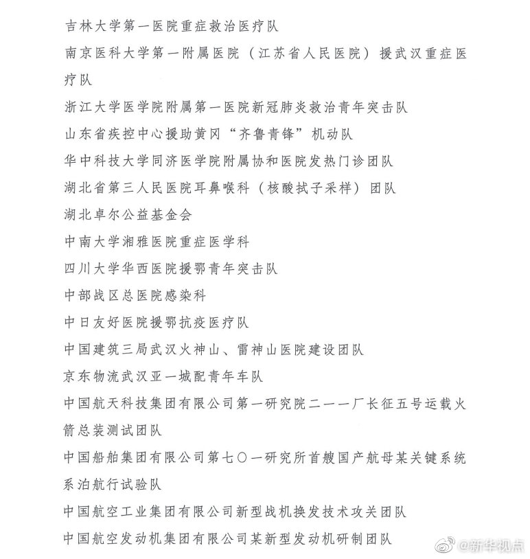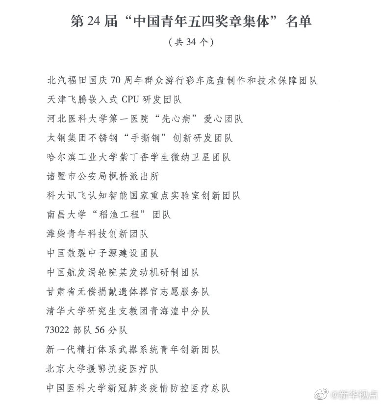 榮獲“中國青年五四獎?wù)录w”的分別是:北汽福田國慶70周年群眾游行彩車底盤制作和技術(shù)保障團(tuán)隊,天津飛騰嵌入式CPU研發(fā)團(tuán)隊,河北醫(yī)科大學(xué)第一醫(yī)院“先心病”愛心團(tuán)隊,太鋼集團(tuán)不銹鋼“手撕鋼”創(chuàng)新研發(fā)團(tuán)隊,哈爾濱工業(yè)大學(xué)紫丁香學(xué)生微納衛(wèi)星團(tuán)隊,諸暨市公安局楓橋派出所,科大訊飛認(rèn)知智能國家重點實驗室創(chuàng)新團(tuán)隊,南昌大學(xué)“稻漁工程”團(tuán)隊,濰柴青年科技創(chuàng)新團(tuán)隊,中國散裂中子源建設(shè)團(tuán)隊,中國航發(fā)渦輪院某發(fā)動機(jī)研制團(tuán)隊,甘肅省無償捐獻(xiàn)遺體器官志愿服務(wù)隊,清華大學(xué)研究生支教團(tuán)青海湟中分隊,73022部隊56分隊,新一代精打體系武器系統(tǒng)青年創(chuàng)新團(tuán)隊,北京大學(xué)援鄂抗疫醫(yī)療隊,中國醫(yī)科大學(xué)新冠肺炎疫情防控醫(yī)療總隊,吉林大學(xué)第一醫(yī)院重癥救治醫(yī)療隊,南京醫(yī)科大學(xué)第一附屬醫(yī)院(江蘇省人民醫(yī)院)援武漢重癥醫(yī)療隊,浙江大學(xué)醫(yī)學(xué)院附屬第一醫(yī)院新冠肺炎救治青年突擊隊,山東省疾控中心援助黃岡“齊魯青鋒”機(jī)動隊,華中科技大學(xué)同濟(jì)醫(yī)學(xué)院附屬協(xié)和醫(yī)院發(fā)熱門診團(tuán)隊,湖北省第三人民醫(yī)院耳鼻喉科(核酸拭子采樣)團(tuán)隊,湖北卓爾公益基金會,中南大學(xué)湘雅醫(yī)院重癥醫(yī)學(xué)科,四川大學(xué)華西醫(yī)院援鄂青年突擊隊,中部戰(zhàn)區(qū)總醫(yī)院感染科,中日友好醫(yī)院援鄂抗疫醫(yī)療隊,中國建筑三局武漢火神山、雷神山醫(yī)院建設(shè)團(tuán)隊,京東物流武漢亞一城配青年車隊,中國航天科技集團(tuán)有限公司第一研究院二一一廠長征五號運載火箭總裝測試團(tuán)隊,中國船舶集團(tuán)有限公司第七〇一研究所首艘國產(chǎn)航母某關(guān)鍵系統(tǒng)系泊航行試驗隊,中國航空工業(yè)集團(tuán)有限公司新型戰(zhàn)機(jī)換發(fā)技術(shù)攻關(guān)團(tuán)隊,中國航空發(fā)動機(jī)集團(tuán)有限公司某新型發(fā)動機(jī)研制團(tuán)隊。