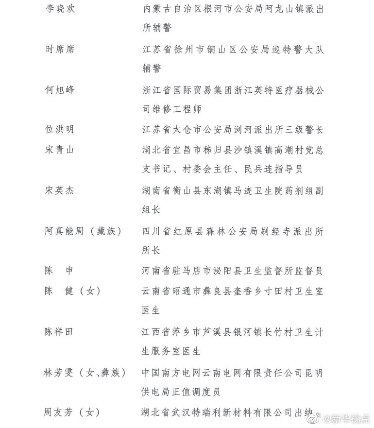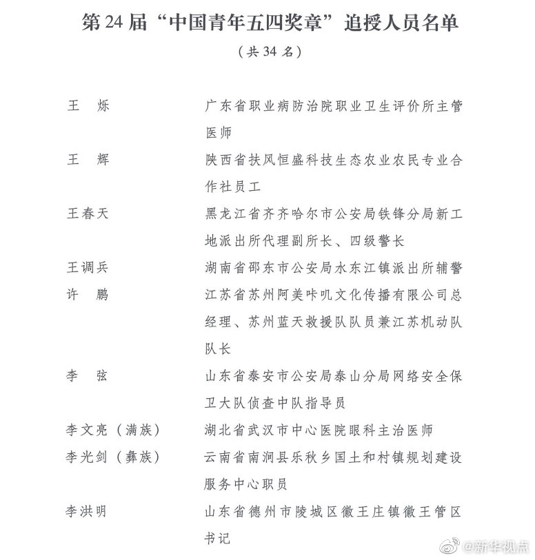 第24屆“中國青年五四獎?wù)隆弊肥谌藛T分別是:廣東省職業(yè)病防治院職業(yè)衛(wèi)生評價所主管醫(yī)師王爍,陜西省扶風(fēng)恒盛科技生態(tài)農(nóng)業(yè)農(nóng)民專業(yè)合作社員工王輝,黑龍江省齊齊哈爾市公安局鐵鋒分局新工地派出所代理副所長、四級警長王春天,湖南省邵東市公安局水東江鎮(zhèn)派出所輔警王調(diào)兵,江蘇省蘇州阿美咔嘰文化傳播有限公司總經(jīng)理、蘇州藍(lán)天救援隊隊員兼江蘇機(jī)動隊隊長許鵬,山東省泰安市公安局泰山分局網(wǎng)絡(luò)安全保衛(wèi)大隊偵查中隊指導(dǎo)員李弦,湖北省武漢市中心醫(yī)院眼科主治醫(yī)師李文亮(滿族),云南省南澗縣樂秋鄉(xiāng)國土和村鎮(zhèn)規(guī)劃建設(shè)服務(wù)中心職員李光劍(彝族),山東省德州市陵城區(qū)徽王莊鎮(zhèn)徽王管區(qū)書記李洪明,內(nèi)蒙古自治區(qū)根河市公安局阿龍山鎮(zhèn)派出所輔警李曉歡,江蘇省徐州市銅山區(qū)公安局巡特警大隊輔警時席席,浙江省國際貿(mào)易集團(tuán)浙江英特醫(yī)療器械公司維修工程師何旭峰,江蘇省太倉市公安局瀏河派出所三級警長位洪明,湖北省宜昌市秭歸縣沙鎮(zhèn)溪鎮(zhèn)高潮村黨總支書記、村委會主任、民兵連指導(dǎo)員宋青山,湖南省衡山縣東湖鎮(zhèn)馬跡衛(wèi)生院藥劑組副組長宋英杰,四川省紅原縣森林公安局刷經(jīng)寺派出所所長阿真能周(藏族),河南省駐馬店市泌陽縣衛(wèi)生監(jiān)督所監(jiān)督員陳申,云南省昭通市彝良縣奎香鄉(xiāng)寸田村衛(wèi)生室醫(yī)生陳?。ㄅ?,江西省萍鄉(xiāng)市蘆溪縣銀河鎮(zhèn)長竹村衛(wèi)生計生服務(wù)室醫(yī)生陳祥田,中國南方電網(wǎng)云南電網(wǎng)有限責(zé)任公司昆明供電局正值調(diào)度員林芳雯(女、彝族),湖北省武漢特瑞利新材料有限公司出納周友芳(女),安徽省銅陵市樅陽縣公安局特(巡)警大隊輔警一中隊副隊長胡鋒,四川省甘孜藏族自治州得榮縣龍絨寺寺廟管理委員會主任洛絨益西(藏族),四川省廣元經(jīng)開區(qū)盤龍鎮(zhèn)深溝村村民宮高明,江蘇省南京市公安局高淳分局淳溪派出所輔警袁劍雄,山東省泰安市岱岳區(qū)角峪鎮(zhèn)先鋒村村民賈慶臣,湖北省武漢市蔡甸區(qū)人民醫(yī)院住院醫(yī)師夏思思(女),江蘇省南京市公安局行政審批服務(wù)處網(wǎng)絡(luò)政務(wù)科一級警員徐昊,江蘇省徐州市沛縣公安局五段派出所輔警章良志,湖北省武漢市江夏區(qū)第一人民醫(yī)院醫(yī)師彭銀華,廣東省英德市公安局橋頭派出所輔警曾文聰,江西省蓮花縣湖上鄉(xiāng)中心衛(wèi)生院醫(yī)生熊波,河南省鄭州市公安局東風(fēng)路分局治安管理服務(wù)大隊三中隊民警、四級警長樊樹鋒,甘肅省舟曲縣扶貧辦副主任張小娟(女、藏族)。