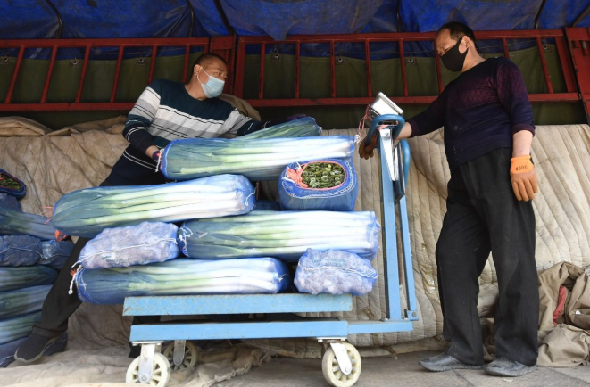 4月13日,新發(fā)地市場,批發(fā)商正在對(duì)來自上海的凈蔥進(jìn)行過秤。為實(shí)現(xiàn)垃圾減量,新發(fā)地鼓勵(lì)商戶“凈菜進(jìn)京”,大蔥、洋蔥等“主菜”在產(chǎn)地裝車時(shí),就去掉了多余部分。