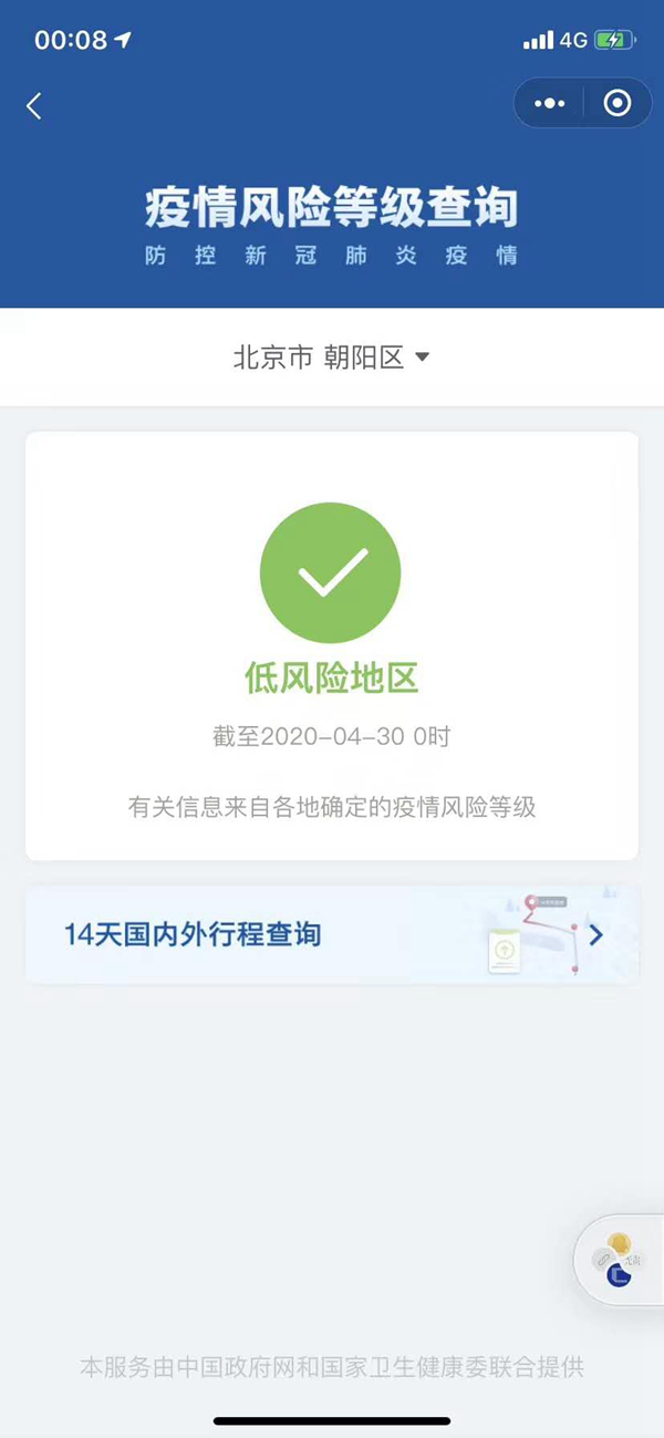 4月30日,疫情風(fēng)險(xiǎn)等級查詢系統(tǒng)顯示,北京朝陽區(qū)降為低風(fēng)險(xiǎn)地區(qū)。此前,朝陽區(qū)為全國唯一高風(fēng)險(xiǎn)地區(qū)。4月29日 ,北京市宣布4月30日起公共衛(wèi)生應(yīng)急響應(yīng)級別由一級降至二級。(李金磊)
