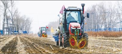 今年備春耕,吉林省農(nóng)安縣哈拉海鎮(zhèn)創(chuàng)業(yè)村農(nóng)民楊守奎帶領(lǐng)合作社五十來戶農(nóng)民,開著拖拉機(jī),拖掛上埋管機(jī)器,把兩指多寬的黑色滴灌膠管埋進(jìn)壟里。
