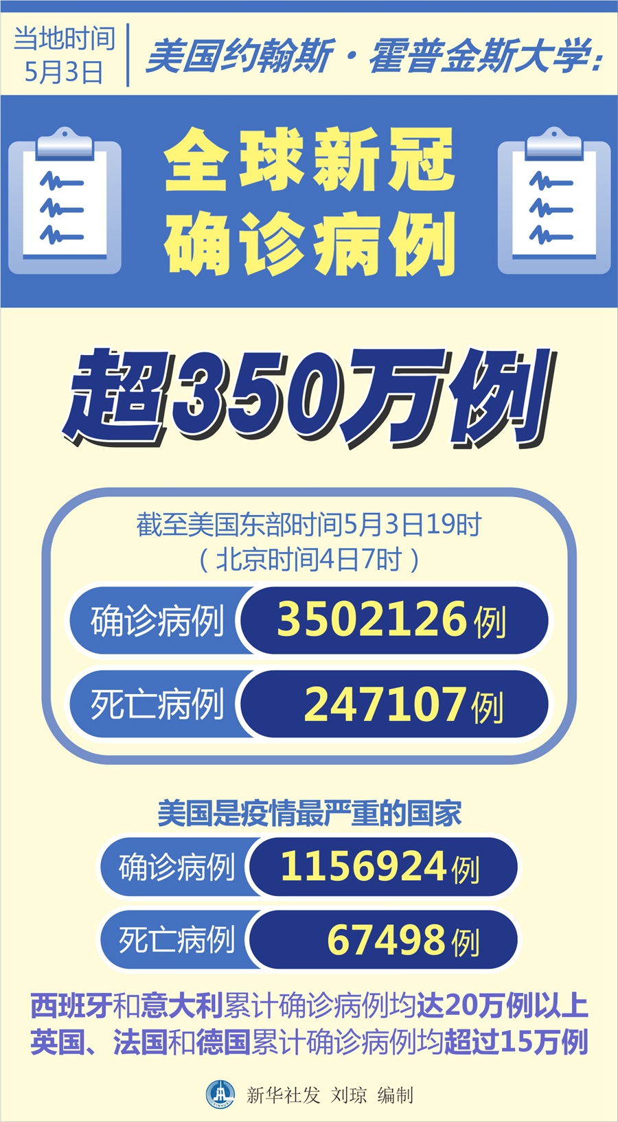 新華社紐約5月3日電 美國(guó)約翰斯·霍普金斯大學(xué)3日發(fā)布的新冠疫情最新統(tǒng)計(jì)數(shù)據(jù)顯示,全球累計(jì)確診病例超過350萬例。