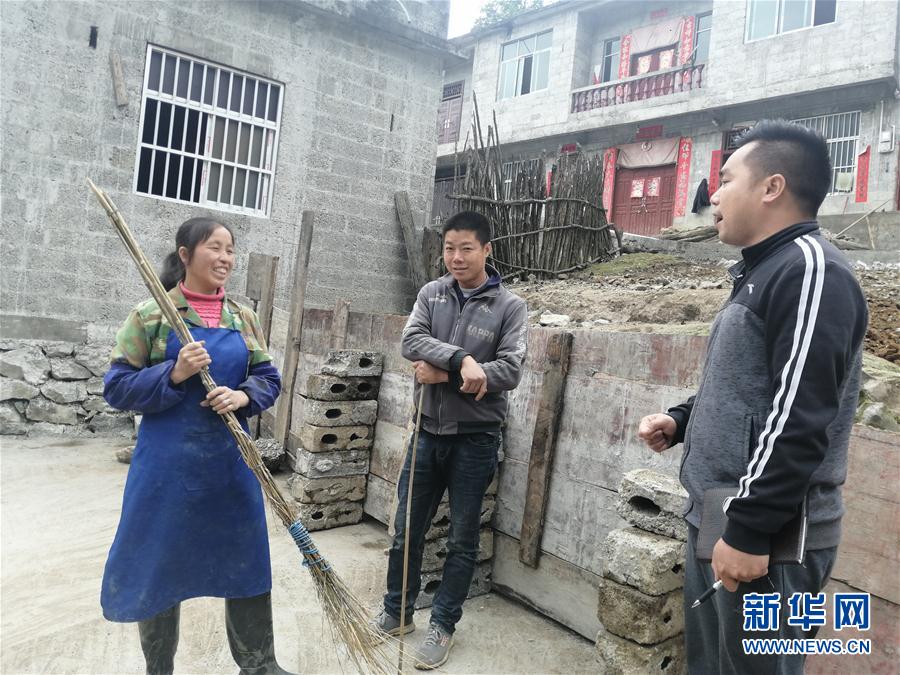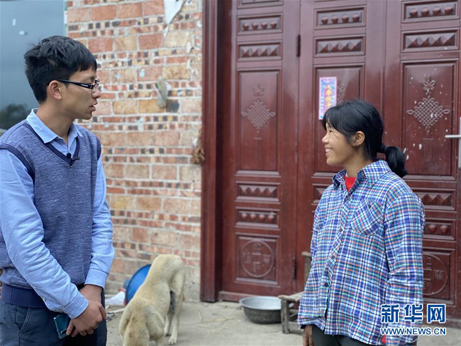 結(jié)束入戶調(diào)查后,廣西田林縣八渡瑤族鄉(xiāng)六林村駐村第一書記牟海迪(左)與貧困戶告別(4月24日攝)。 新華社記者 王軍偉 攝