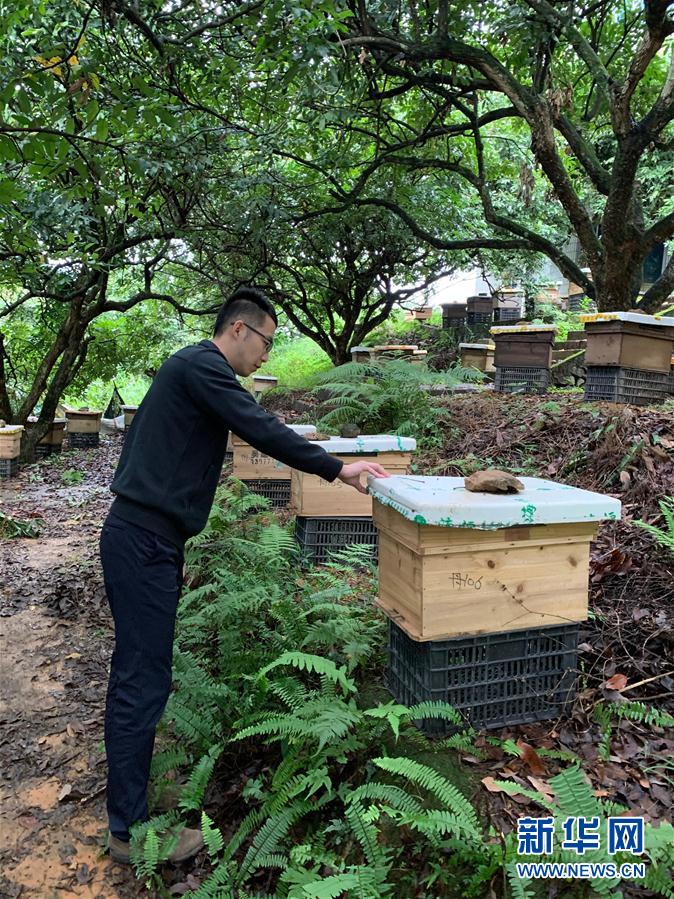 廣西大化瑤族自治縣古河鄉(xiāng)丹桂村駐村第一書記馬騰在查看蜜蜂養(yǎng)殖情況(4月22日攝)。 新華社記者 何偉 攝