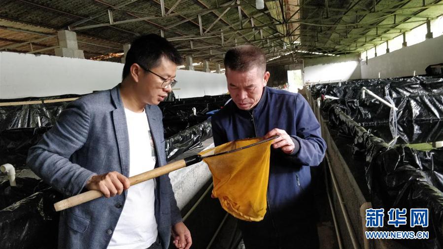 廣西上林縣西燕鎮(zhèn)岜獨(dú)村駐村第一書記康勇(左一)在龜鱉養(yǎng)殖場(chǎng)和養(yǎng)殖能人交流(4月24日攝)。 新華社記者 農(nóng)冠斌 攝