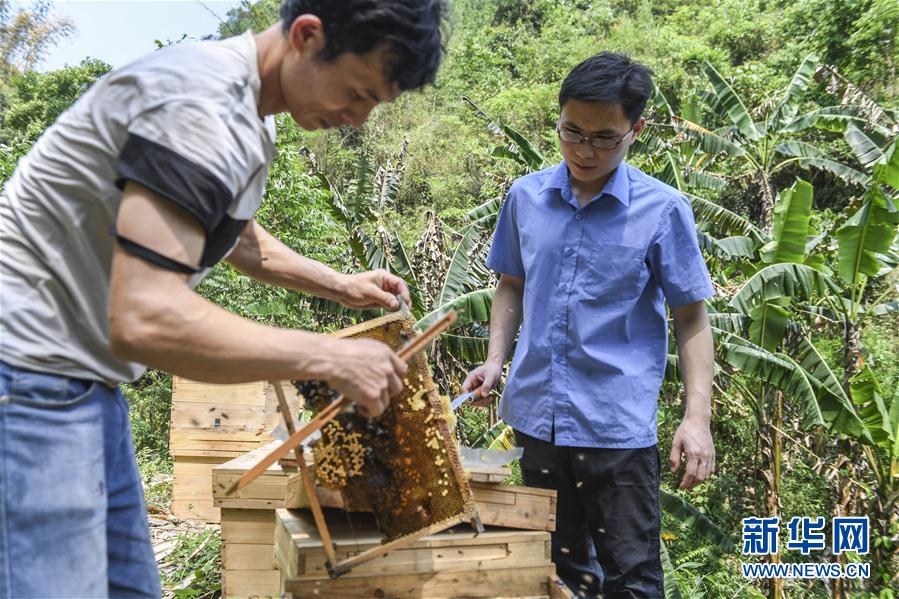 廣西樂(lè)業(yè)縣新化鎮(zhèn)百坭村扶貧工作隊(duì)員譚天社(右)與村民班華六在查看蜂巢(4月20日攝)。 新華社記者 曹祎銘 攝