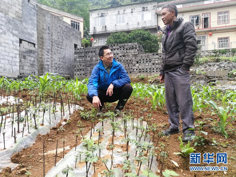 廣西都安瑤族自治縣保安鄉(xiāng)元力村駐村第一書記沈彥東(左)在建檔立卡貧困戶周振東的田地里跟他一起謀劃產(chǎn)業(yè)發(fā)展(4月24日攝)。 新華社記者 何偉 攝