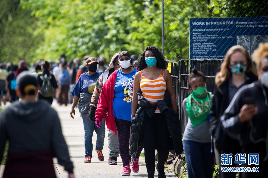 5月3日,在美國紐約,人們在一個發(fā)放點(diǎn)排隊領(lǐng)取口罩。 新華社發(fā)(郭克攝)