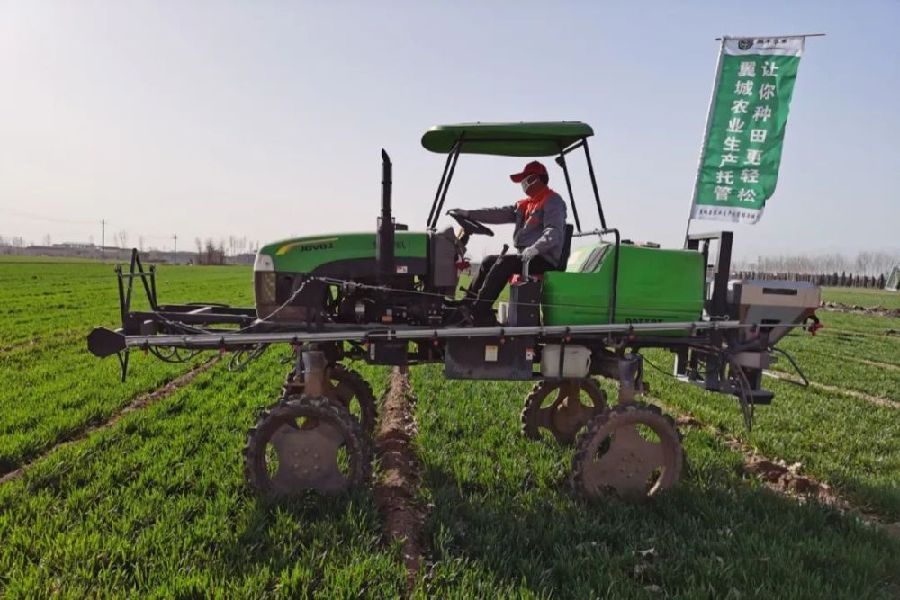 農(nóng)業(yè)托管改變了當(dāng)?shù)氐霓r(nóng)業(yè)生產(chǎn)方式,山西省翼城縣新翔豐農(nóng)業(yè)科技有限公司植保作業(yè)人員在田間進(jìn)行除草作業(yè) 李虎威 攝