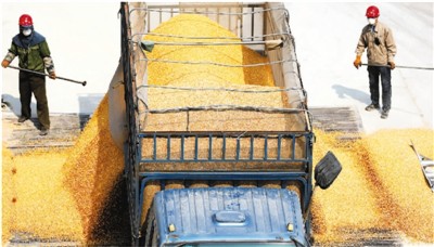 4月13日,在遼寧省鞍山市臺(tái)安縣新開(kāi)河糧食儲(chǔ)備庫(kù),兩名工作人員卸載剛剛收儲(chǔ)的玉米。新華社記者 姚劍鋒攝