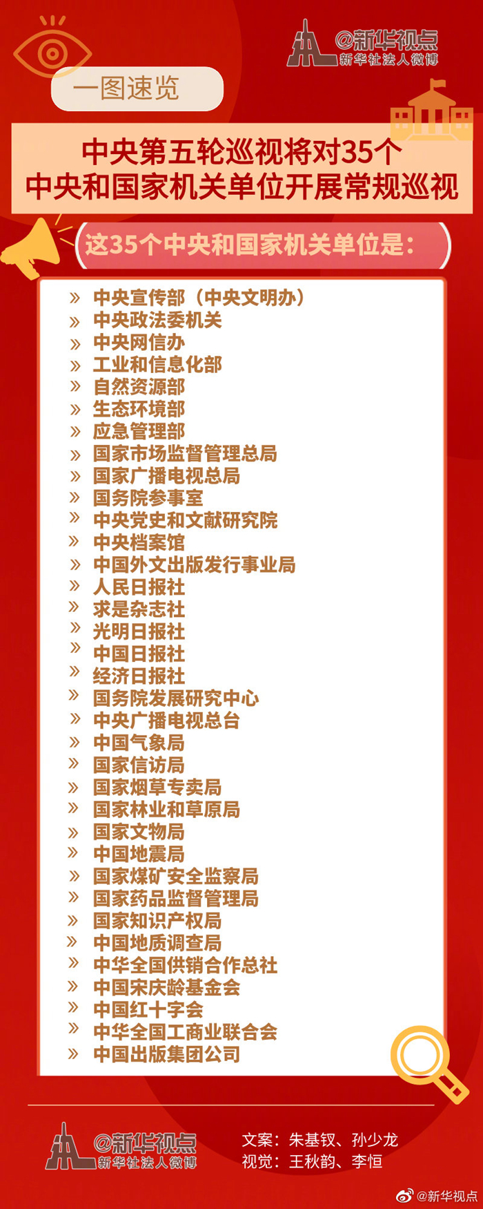 新華社北京5月9日電 經(jīng)黨中央批準,十九屆中央第五輪巡視將對中央宣傳部(中央文明辦)、中央政法委機關(guān)、中央網(wǎng)信辦、工業(yè)和信息化部、自然資源部、生態(tài)環(huán)境部、應(yīng)急管理部、國家市場監(jiān)督管理總局、國家廣播電視總局、國務(wù)院參事室、中央黨史和文獻研究院、中央檔案館、中國外文出版發(fā)行事業(yè)局、人民日報社、求是雜志社、光明日報社、中國日報社、經(jīng)濟日報社、國務(wù)院發(fā)展研究中心、中央廣播電視總臺、中國氣象局、國家信訪局、國家煙草專賣局、國家林業(yè)和草原局、國家文物局、中國地震局、國家煤礦安全監(jiān)察局、國家藥品監(jiān)督管理局、國家知識產(chǎn)權(quán)局、中國地質(zhì)調(diào)查局、中華全國供銷合作總社、中國宋慶齡基金會、中國紅十字會、中華全國工商業(yè)聯(lián)合會、中國出版集團公司等35個中央和國家機關(guān)單位黨組織開展常規(guī)巡視。