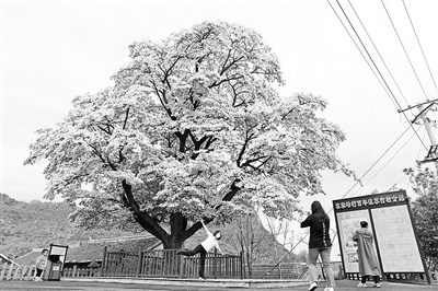 游人在流蘇古樹(shù)旁拍照留念