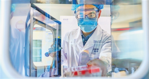 工作人員在國藥集團(tuán)中國生物新冠疫苗生產(chǎn)基地質(zhì)量檢定部門從傳遞窗拿取新型冠狀病毒滅活疫苗樣品。 新華社記者 張玉薇攝