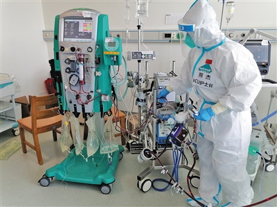 熊杰在隔離病房檢查ECOM管路。受訪者供圖