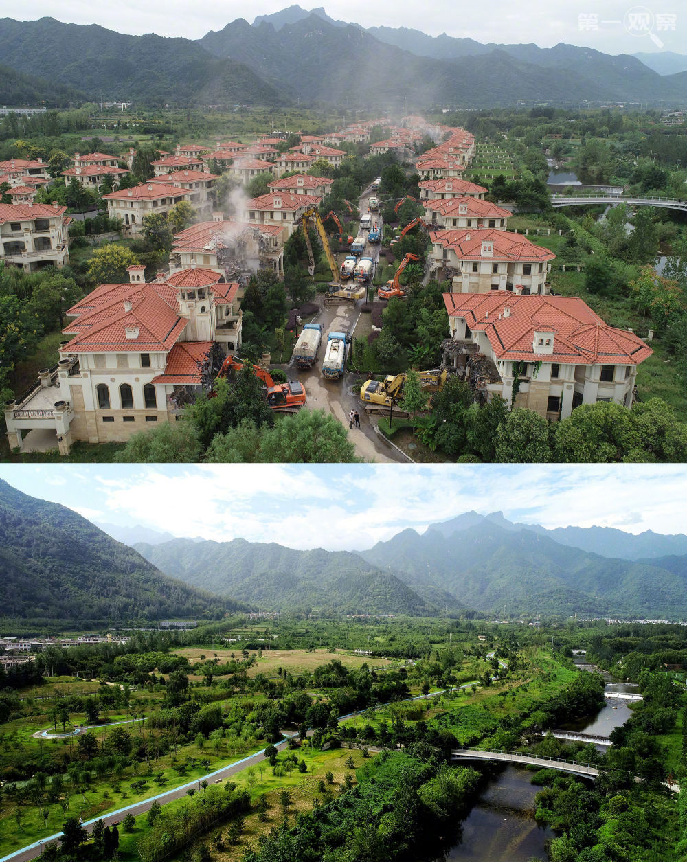 ?↑拼版照片:上圖為2018年9月,西安市長安區(qū)對轄區(qū)內(nèi)東大街道的秦嶺違建別墅“群賢別業(yè)”進行拆除(新華社記者 邵瑞 攝);下圖為2019年7月拍攝的秦嶺違建別墅“群賢別業(yè)”拆除后建設(shè)的秦嶺和諧森林公園(新華社記者 劉瀟 攝)。