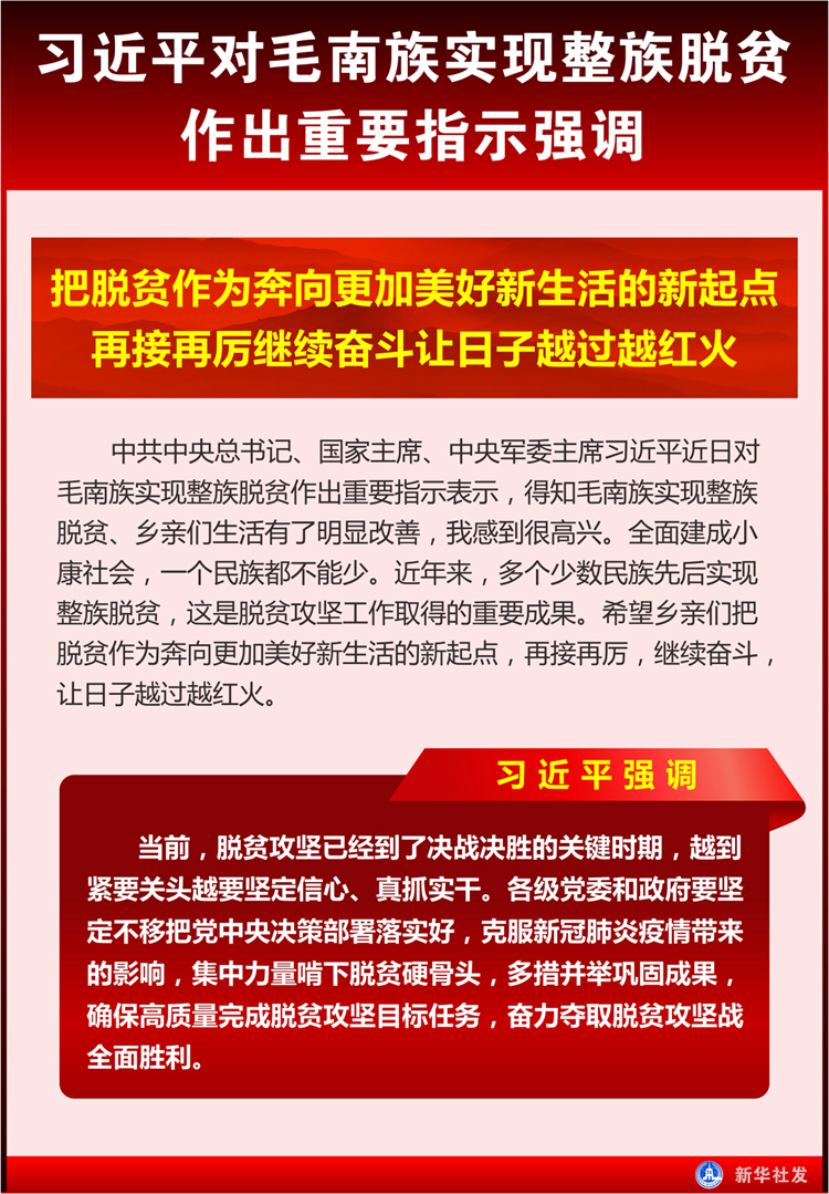 新華社北京5月20日電? 中共中央總書記、國(guó)家主席、中央軍委主席習(xí)近平近日對(duì)毛南族實(shí)現(xiàn)整族脫貧作出重要指示表示,得知毛南族實(shí)現(xiàn)整族脫貧、鄉(xiāng)親們生活有了明顯改善,我感到很高興。全面建成小康社會(huì),一個(gè)民族都不能少。近年來(lái),多個(gè)少數(shù)民族先后實(shí)現(xiàn)整族脫貧,這是脫貧攻堅(jiān)工作取得的重要成果。希望鄉(xiāng)親們把脫貧作為奔向更加美好新生活的新起點(diǎn),再接再厲,繼續(xù)奮斗,讓日子越過(guò)越紅火。