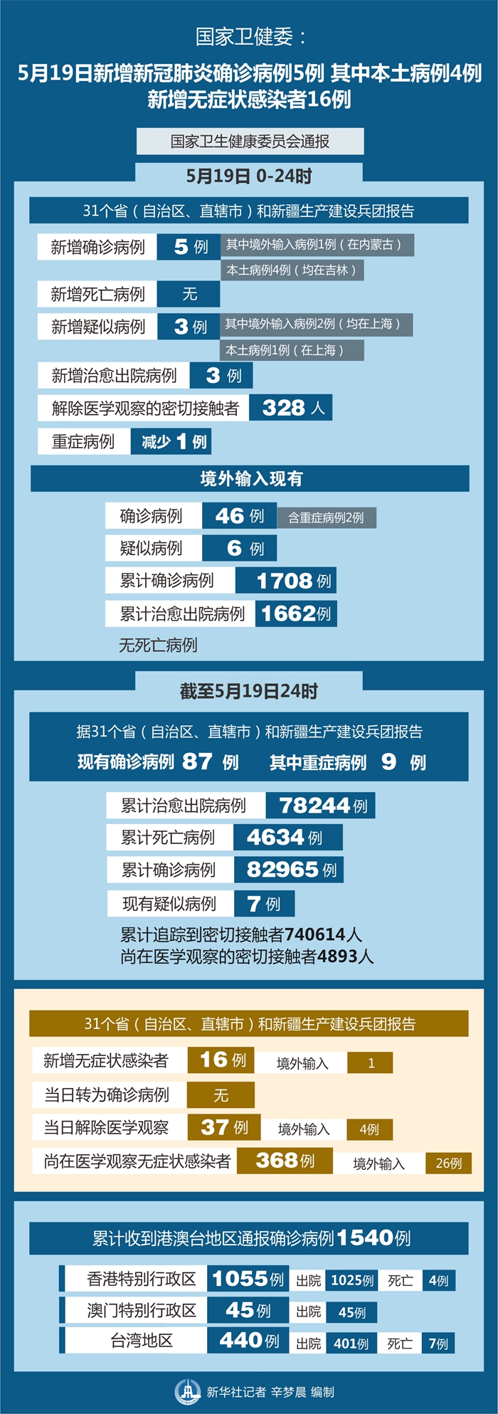 截至5月19日24時(shí),據(jù)31個(gè)?。ㄗ灾螀^(qū)、直轄市)和新疆生產(chǎn)建設(shè)兵團(tuán)報(bào)告,現(xiàn)有確診病例87例(其中重癥病例9例),累計(jì)治愈出院病例78244例,累計(jì)死亡病例4634例,累計(jì)報(bào)告確診病例82965例,現(xiàn)有疑似病例7例。累計(jì)追蹤到密切接觸者740614人,尚在醫(yī)學(xué)觀察的密切接觸者4893人。