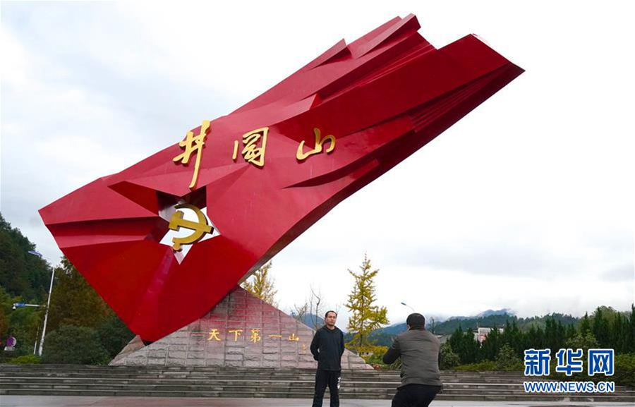 游客在井岡山的“井岡紅旗”雕塑前參觀(guān)留影(2018年11月21日攝)。 新華社記者 胡晨歡 攝