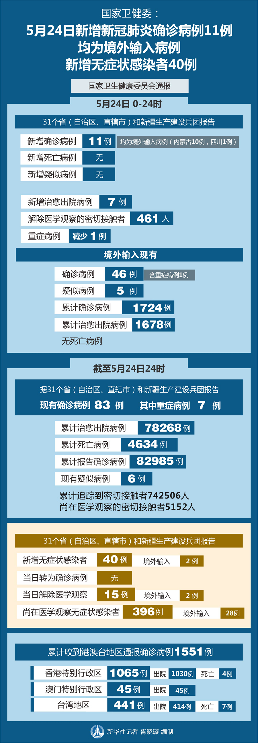 截至5月24日24時,據(jù)31個省(自治區(qū)、直轄市)和新疆生產(chǎn)建設(shè)兵團報告,現(xiàn)有確診病例83例(其中重癥病例7例),累計治愈出院病例78268例,累計死亡病例4634例,累計報告確診病例82985例,現(xiàn)有疑似病例6例。累計追蹤到密切接觸者742506人,尚在醫(yī)學(xué)觀察的密切接觸者5152人。