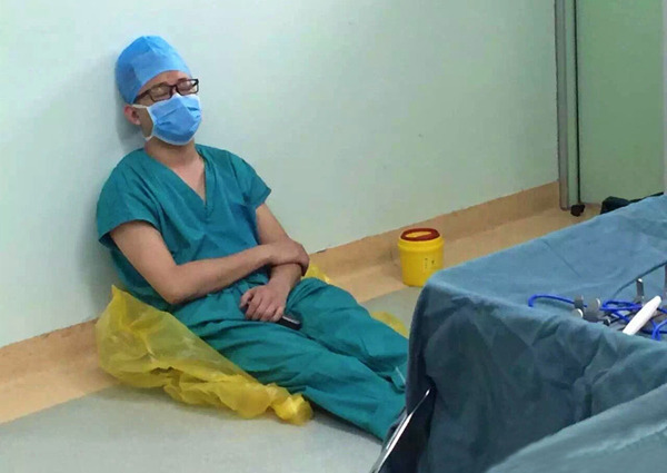 在幾臺(tái)手術(shù)的間隙,于鐵夫睡倒在手術(shù)室里(資料照片)。新華社發(fā)