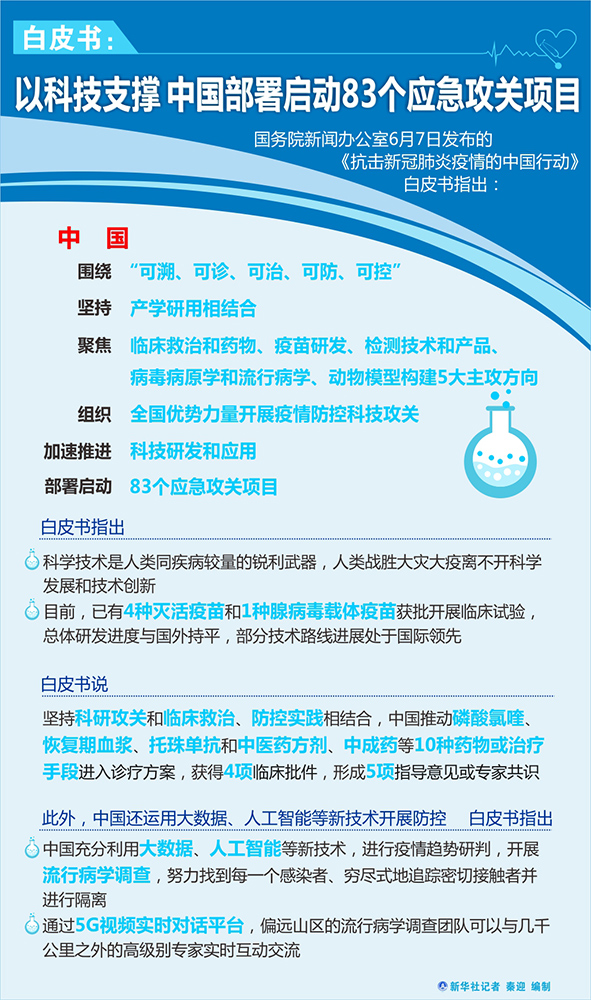 新華社北京6月7日電(記者胡喆)國務(wù)院新聞辦公室7日發(fā)布的《抗擊新冠肺炎疫情的中國行動(dòng)》白皮書指出,中國圍繞“可溯、可診、可治、可防、可控”,堅(jiān)持產(chǎn)學(xué)研用相結(jié)合,聚焦臨床救治和藥物、疫苗研發(fā)、檢測技術(shù)和產(chǎn)品、病毒病原學(xué)和流行病學(xué)、動(dòng)物模型構(gòu)建5大主攻方向,組織全國優(yōu)勢力量開展疫情防控科技攻關(guān),加速推進(jìn)科技研發(fā)和應(yīng)用,部署啟動(dòng)83個(gè)應(yīng)急攻關(guān)項(xiàng)目。