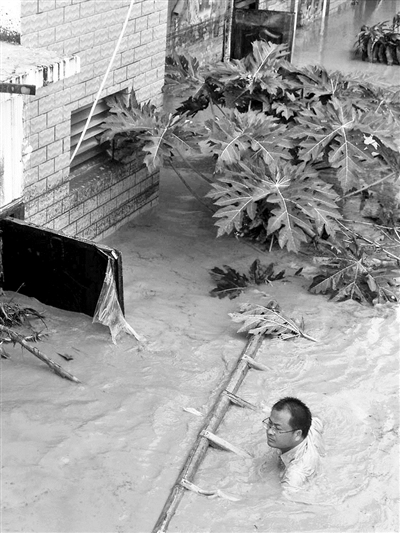 廣西田林暴雨引發(fā)泥石流,6月6日,利周瑤族鄉(xiāng)鄉(xiāng)長(zhǎng)陸富雙涉水前往敬老院營救被困老人供圖/新華社