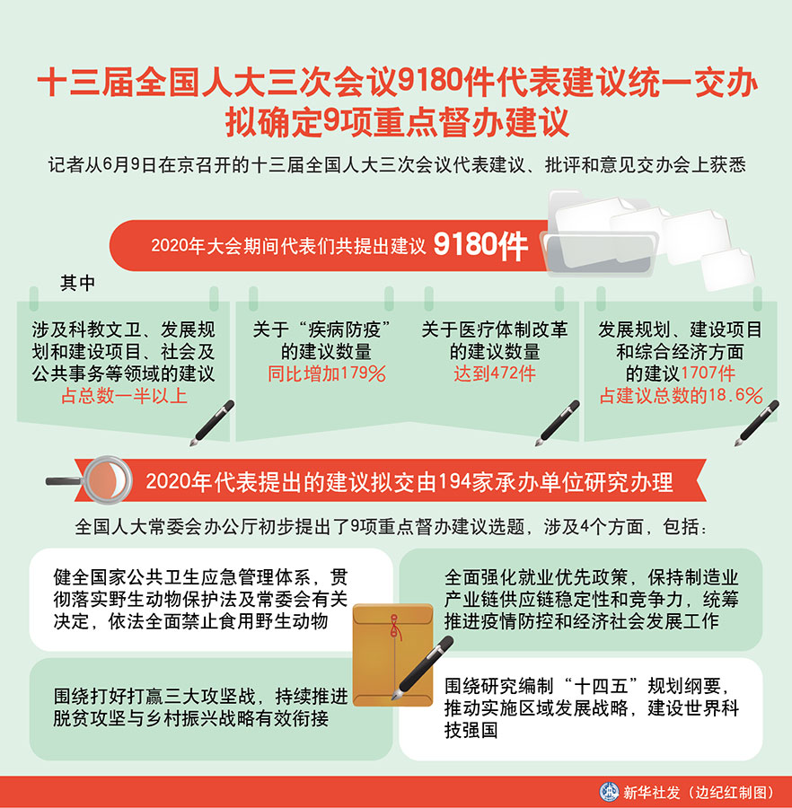 按照代表法有關規(guī)定,今年代表提出的建議擬交由194家承辦單位研究辦理。全國人大常委會辦公廳初步提出了9項重點督辦建議選題,涉及4個方面,包括:健全國家公共衛(wèi)生應急管理體系,貫徹落實野生動物保護法及常委會有關決定,依法全面禁止食用野生動物;全面強化就業(yè)優(yōu)先政策,保持制造業(yè)產業(yè)鏈供應鏈穩(wěn)定性和競爭力,統(tǒng)籌推進疫情防控和經濟社會發(fā)展工作;圍繞打好打贏三大攻堅戰(zhàn),持續(xù)推進脫貧攻堅與鄉(xiāng)村振興戰(zhàn)略有效銜接;圍繞研究編制“十四五”規(guī)劃綱要,推動實施區(qū)域發(fā)展戰(zhàn)略,建設世界科技強國。