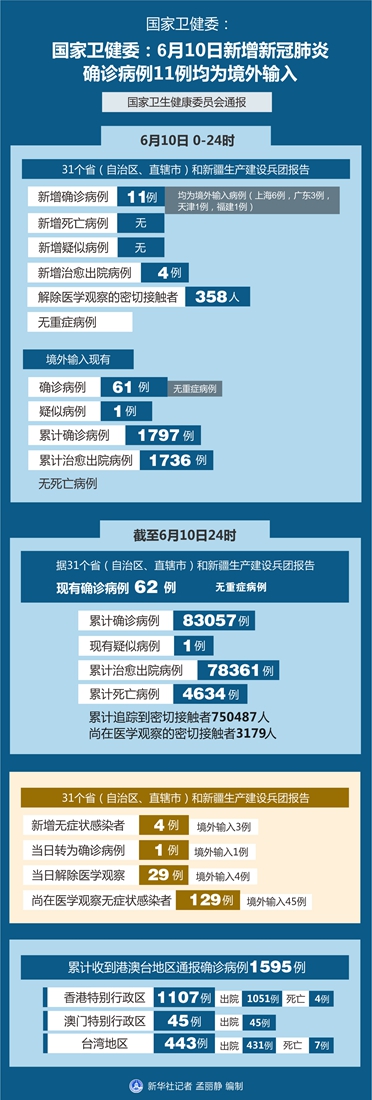 新華社北京6月11日電(記者陳聰)據(jù)國家衛(wèi)生健康委員會11日通報,6月10日0-24時,31個?。ㄗ灾螀^(qū)、直轄市)和新疆生產(chǎn)建設(shè)兵團(tuán)報告新增新冠肺炎確診病例11例,均為境外輸入病例(上海6例,廣東3例,天津1例,福建1例);無新增死亡病例;無新增疑似病例。