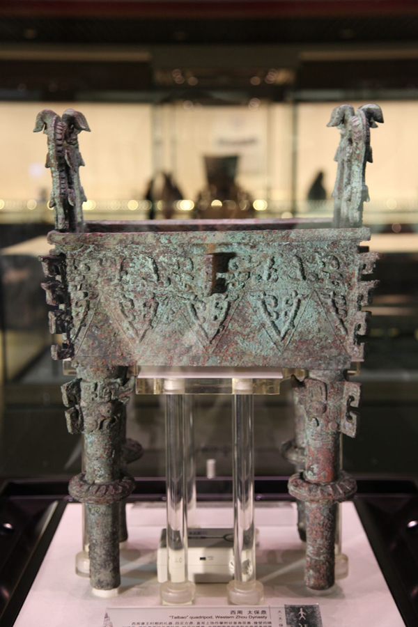 “從形制大小來看,有別于三足圓鼎,這件四足方鼎應(yīng)該是西周早期貴族所用的器物。方鼎高50.7厘米、口徑23.36厘米、重26公斤。方鼎的腹部內(nèi)壁上清晰地鑄有‘大保鑄’三字銘文。據(jù)考證,這‘大保’二字其實應(yīng)該為‘太?!?,因此這件方鼎被稱作太保鼎?!标愖空f。