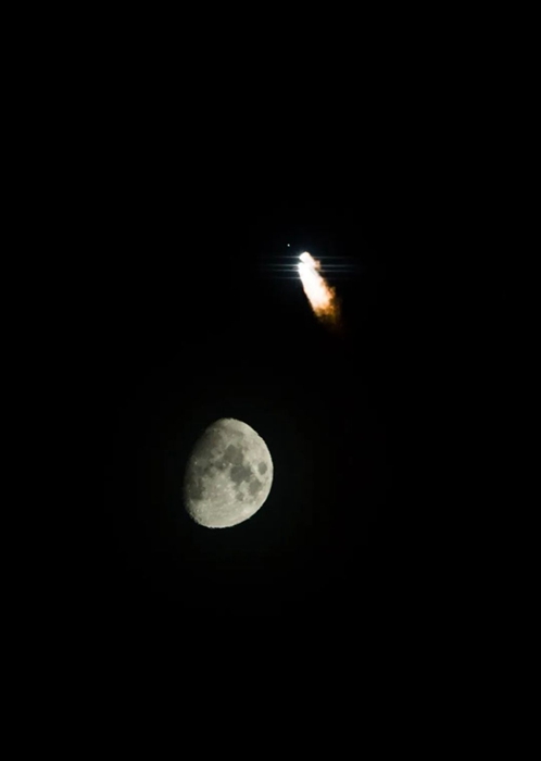 2015年3月30日,搭載首顆新一代北斗導(dǎo)航衛(wèi)星的長征三號(hào)丙運(yùn)載火箭在西昌衛(wèi)星發(fā)射中心點(diǎn)火發(fā)射,火箭升空后與明月交相輝映。新華社記者 白禹 攝