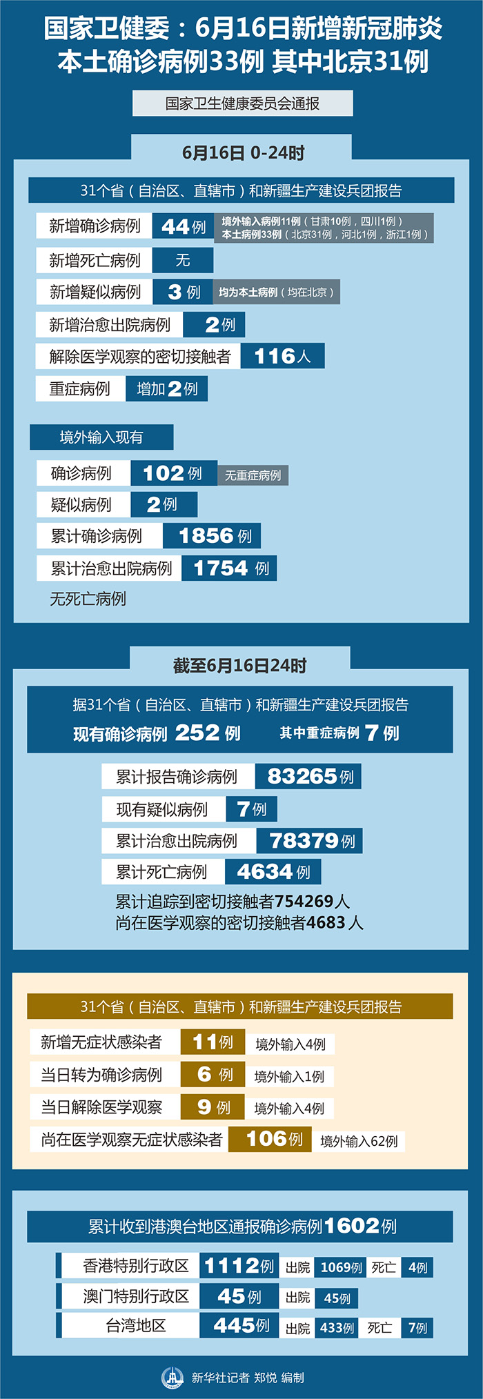 截至6月16日24時(shí),據(jù)31個(gè)?。ㄗ灾螀^(qū)、直轄市)和新疆生產(chǎn)建設(shè)兵團(tuán)報(bào)告,現(xiàn)有確診病例252例(其中重癥病例7例),累計(jì)治愈出院病例78379例,累計(jì)死亡病例4634例,累計(jì)報(bào)告確診病例83265例,現(xiàn)有疑似病例7例。累計(jì)追蹤到密切接觸者754269人,尚在醫(yī)學(xué)觀察的密切接觸者4683人。