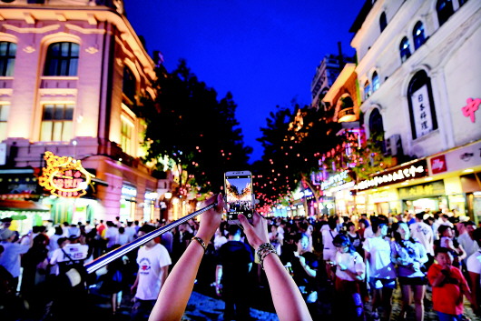 一位游客手機(jī)拍攝夜色中的中央大街(資料片)。本報(bào)記者王建威攝