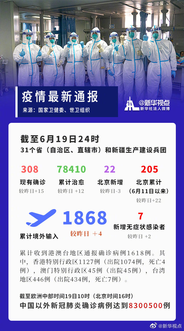 截至6月19日24時(shí),據(jù)31個(gè)?。ㄗ灾螀^(qū)、直轄市)和新疆生產(chǎn)建設(shè)兵團(tuán)報(bào)告,現(xiàn)有確診病例308例(其中重癥病例13例),累計(jì)治愈出院病例78410例,累計(jì)死亡病例4634例,累計(jì)報(bào)告確診病例83352例,現(xiàn)有疑似病例11例。累計(jì)追蹤到密切接觸者756223人,尚在醫(yī)學(xué)觀察的密切接觸者6023人。