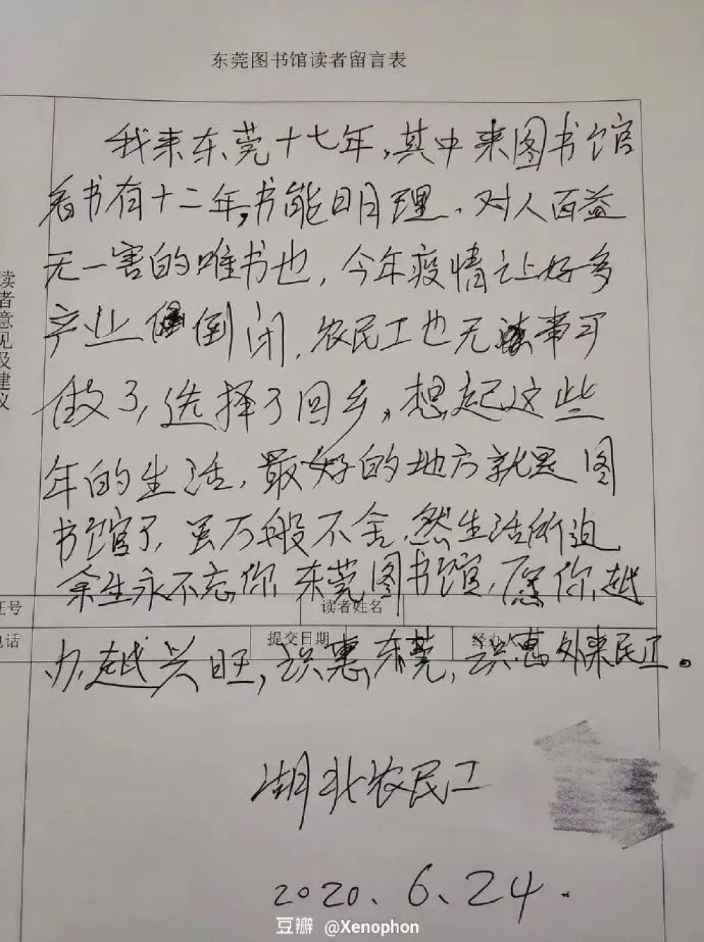 “我來東莞十七年,其中來圖書館看書有十二年。書能明理,對人百益無一害的唯書也。今年疫情讓好多產(chǎn)業(yè)(企業(yè))倒閉,農(nóng)民工也無事可做了,選擇了回鄉(xiāng)。想起這些年的生活,最好的地方就是圖書館了。雖萬般不舍,然生活所迫,余生永不忘你,東莞圖書館,愿你越辦越興旺。識惠東莞,識惠外來農(nóng)民工?!?/span>
