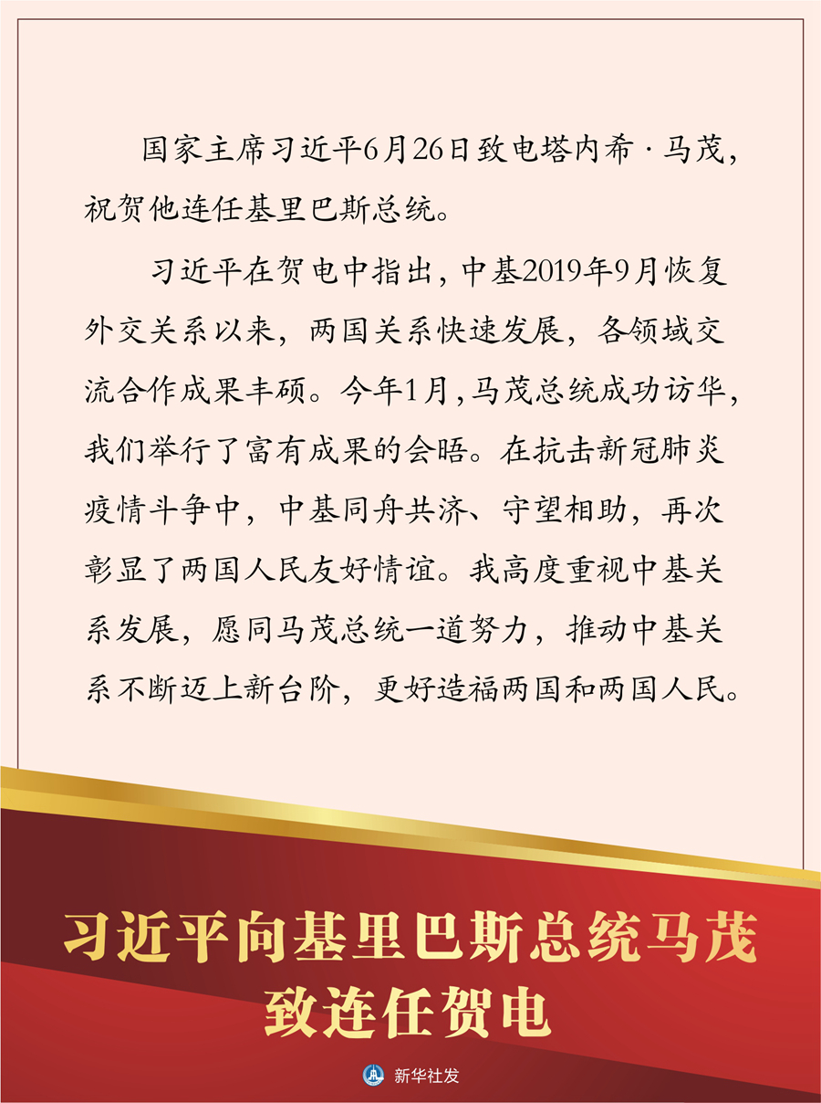 習(xí)近平在賀電中指出,中基2019年9月恢復(fù)外交關(guān)系以來,兩國關(guān)系快速發(fā)展,各領(lǐng)域交流合作成果豐碩。今年1月,馬茂總統(tǒng)成功訪華,我們舉行了富有成果的會(huì)晤。在抗擊新冠肺炎疫情斗爭中,中基同舟共濟(jì)、守望相助,再次彰顯了兩國人民友好情誼。我高度重視中基關(guān)系發(fā)展,愿同馬茂總統(tǒng)一道努力,推動(dòng)中基關(guān)系不斷邁上新臺(tái)階,更好造福兩國和兩國人民。