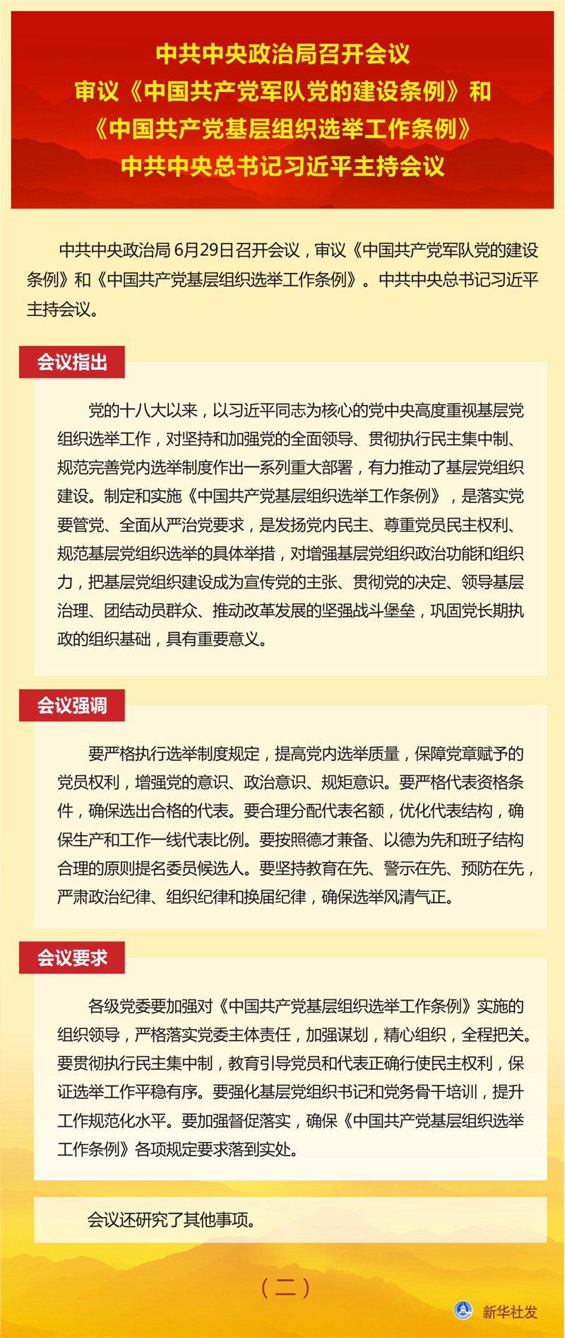 新華社北京6月29日電? 中共中央政治局6月29日召開會議,審議《中國共產(chǎn)黨軍隊黨的建設條例》和《中國共產(chǎn)黨基層組織選舉工作條例》。中共中央總書記習近平主持會議。