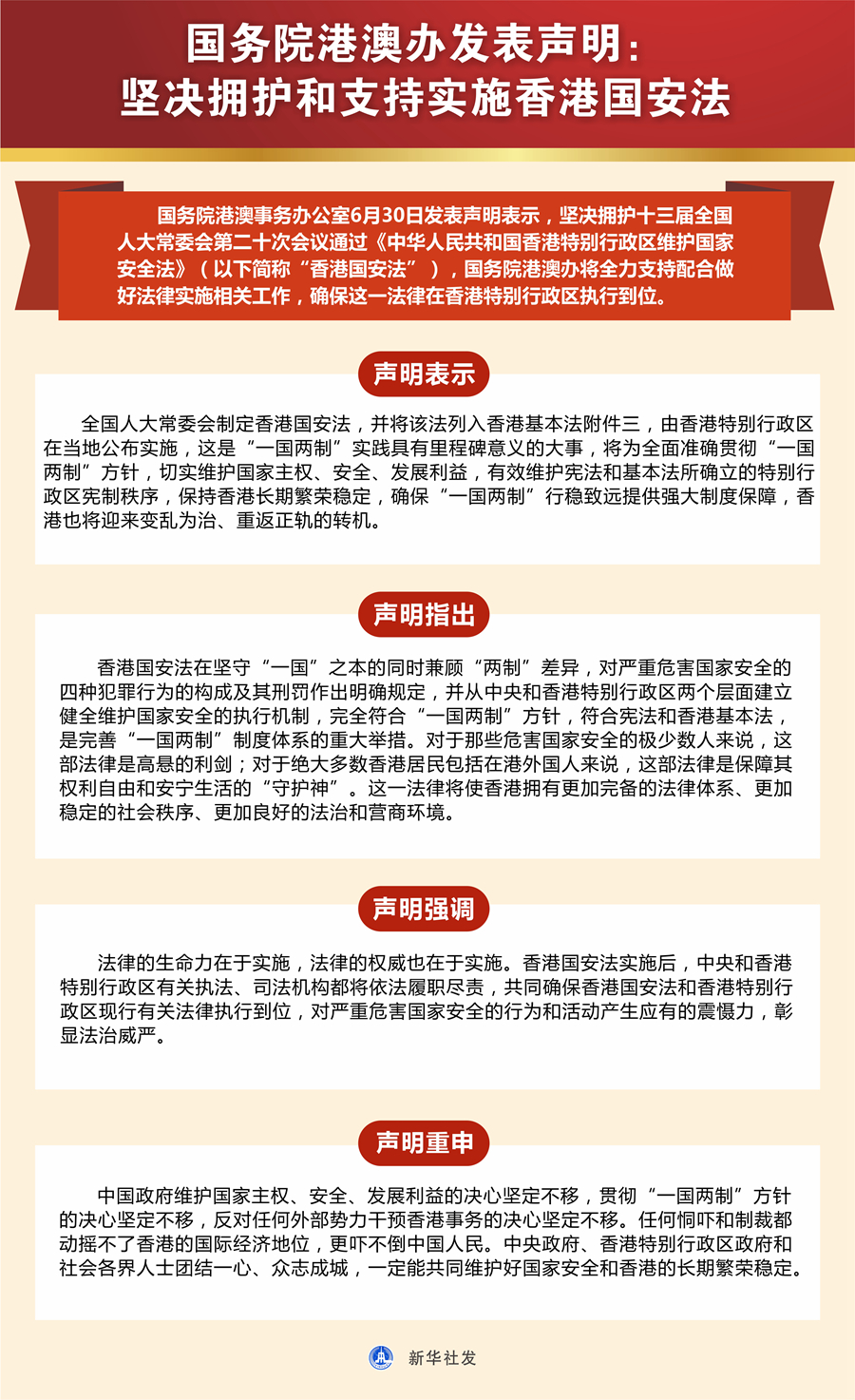 新華社北京6月30日電 國務(wù)院港澳事務(wù)辦公室30日發(fā)表聲明表示,堅決擁護(hù)十三屆全國人大常委會第二十次會議通過《中華人民共和國香港特別行政區(qū)維護(hù)國家安全法》(以下簡稱“香港國安法”),國務(wù)院港澳辦將全力支持配合做好法律實施相關(guān)工作,確保這一法律在香港特別行政區(qū)執(zhí)行到位。