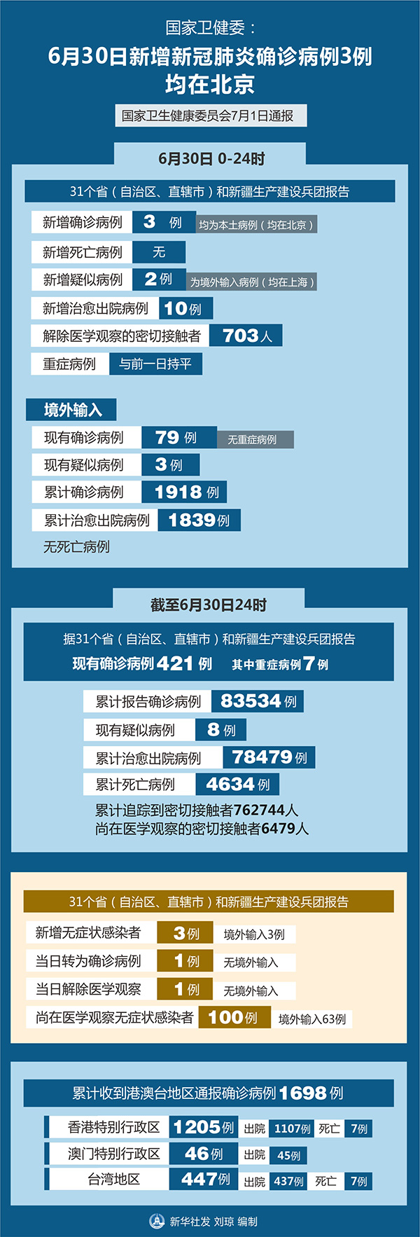 新華社北京7月1日電(記者胡喆)國家衛(wèi)生健康委員會7月1日通報(bào),6月30日0-24時,31個?。ㄗ灾螀^(qū)、直轄市)和新疆生產(chǎn)建設(shè)兵團(tuán)報(bào)告新增確診病例3例,均為本土病例(均在北京);無新增死亡病例;新增疑似病例2例,為境外輸入病例(均在上海)。