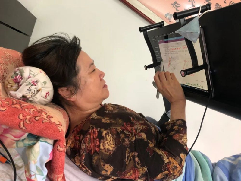 學(xué)校安排其他老師給李靖敏代課。半個(gè)月之后,6月中旬,北京再次出現(xiàn)新增病例,高三年級(jí)又重新回到線上教學(xué)。李靖敏提出,自己可以上網(wǎng)課。她把一個(gè)平板電腦靠著支架固定在身體上方,然后用手寫筆在觸摸屏上書寫、標(biāo)記,這樣在家的學(xué)生就能同步看到。