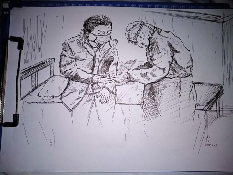 2月27日,來自貴州遵義的援鄂醫(yī)療隊(duì)護(hù)士長李蘭收到了患者送給她的一份珍貴禮物——一幅素描畫。畫中的李蘭正在悉心照顧病患,穿著防護(hù)服的身影,充滿著溫暖的力量……