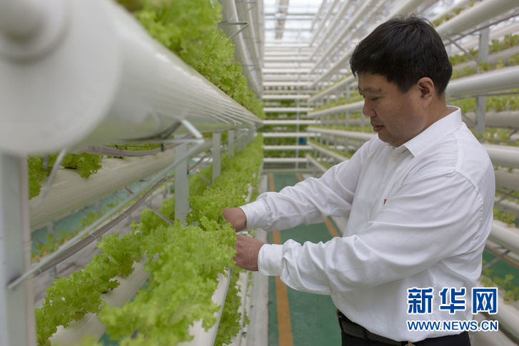 山東省蘭陵縣代村黨委書(shū)記王傳喜在查看無(wú)土栽培蔬菜長(zhǎng)勢(shì)(6月18日攝)。新華社記者王陽(yáng)攝