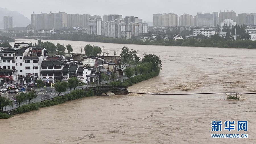 7月7日拍攝的被沖毀的黃山屯溪老大橋。當(dāng)日上午,安徽黃山屯溪老大橋被洪水沖垮毀壞。屯溪老大橋又叫鎮(zhèn)海橋,始建于明代。新華社發(fā)(施亞磊 攝)