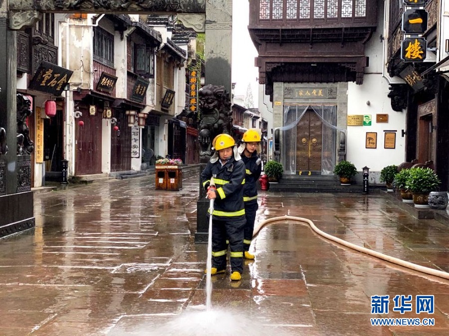 8日上午,屯溪老街正安排清理淤泥雜物,清洗消殺街道,力爭(zhēng)早日恢復(fù)正常。(黃山市屯溪老街街道辦事處提供)