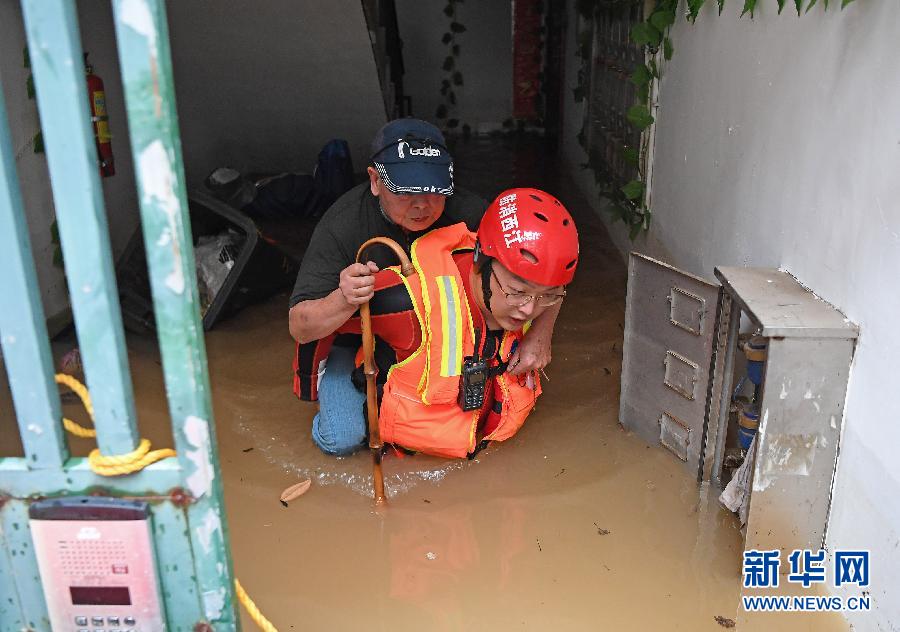 7月8日,在景德鎮(zhèn)市金悅小區(qū),救援人員轉(zhuǎn)移受困群眾。 新華社記者 萬(wàn)象 攝