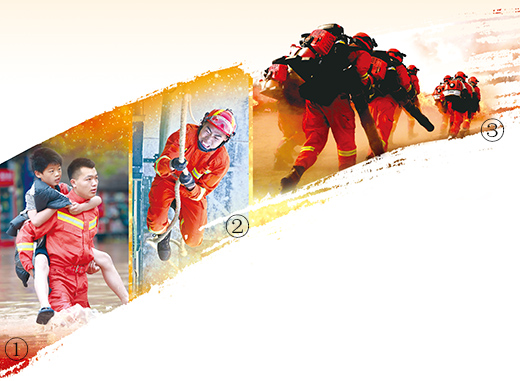 圖①:今年6月底,受暴雨影響,重慶市龍?zhí)逗友鼐€地區(qū)被淹。圖為消防隊(duì)員踏水背出受困群眾。肖樂峰攝(人民視覺) 圖②:在山東省煙臺市消防救援支隊(duì)培訓(xùn)基地,消防隊(duì)員正在參加繩索攀爬比賽。孫文潭攝(人民視覺) 圖③:今年5月,甘肅省森林消防總隊(duì)張掖支隊(duì)開展了實(shí)戰(zhàn)滅火演練。圖為消防隊(duì)員奔赴演練火場。張小軍攝(人民視覺)