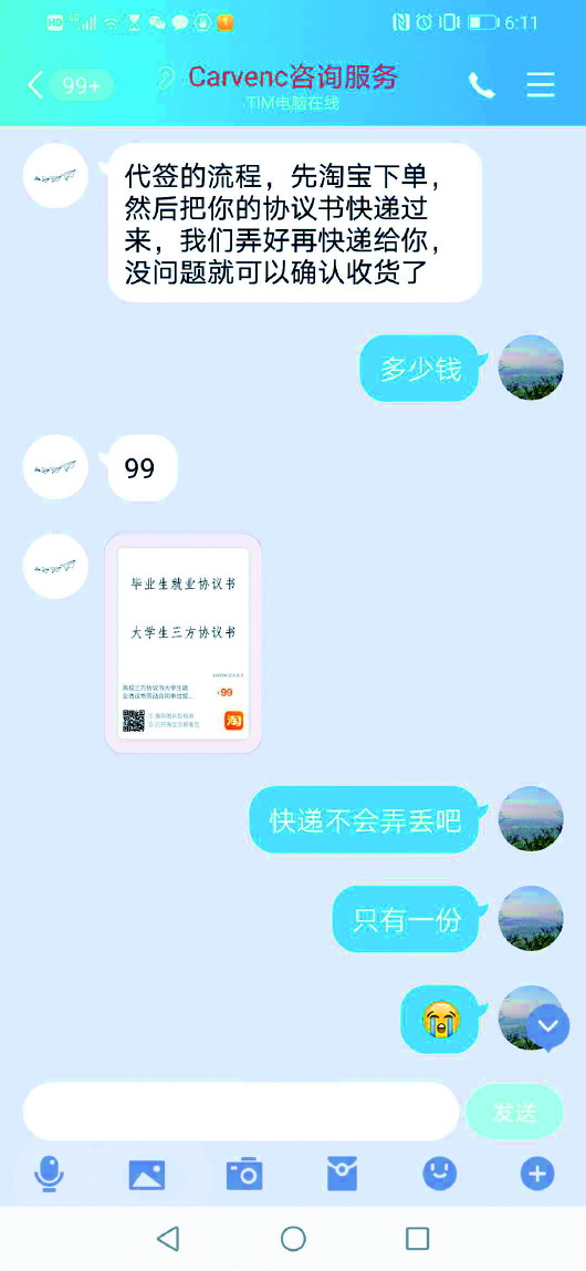 記者調(diào)查發(fā)現(xiàn),一些學校周邊打印店和淘寶賣家,也公然做起簽字蓋章生意。“實在找不到工作單位的,我給你們支個招,去打印店搞一下,十幾元就能搞定?!睘樽寣W生盡快在大學生就業(yè)服務(wù)平臺登記、更新就業(yè)信息,安徽農(nóng)業(yè)大學經(jīng)濟技術(shù)學院某班主任在班級群里,發(fā)了一個可代簽三方協(xié)議的聯(lián)系人方式。