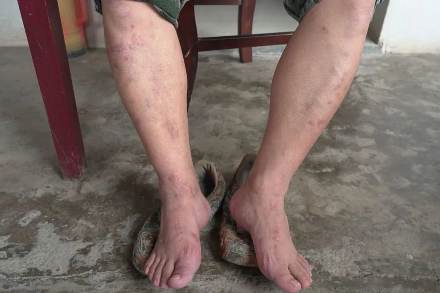 ↑14日,陳壽春的腳已經(jīng)基本恢復,腿上傷疤依舊明顯。(新華社記者 屈彥攝)